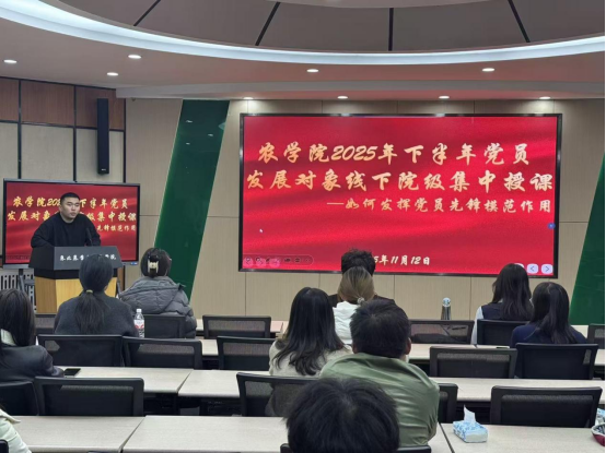 为贯彻落实《中国共产党发展党员工作细则》要求,严格履行发展党员程序,高质量完成本年度发展党员工作,农学院党委分党校精心组织,于2025年11月11日—11月17日开展发展对象专题培训,通过“以考促学、以讲促思、以研促悟、以干促行”联动模式,推动培训走深走实、见行见效。