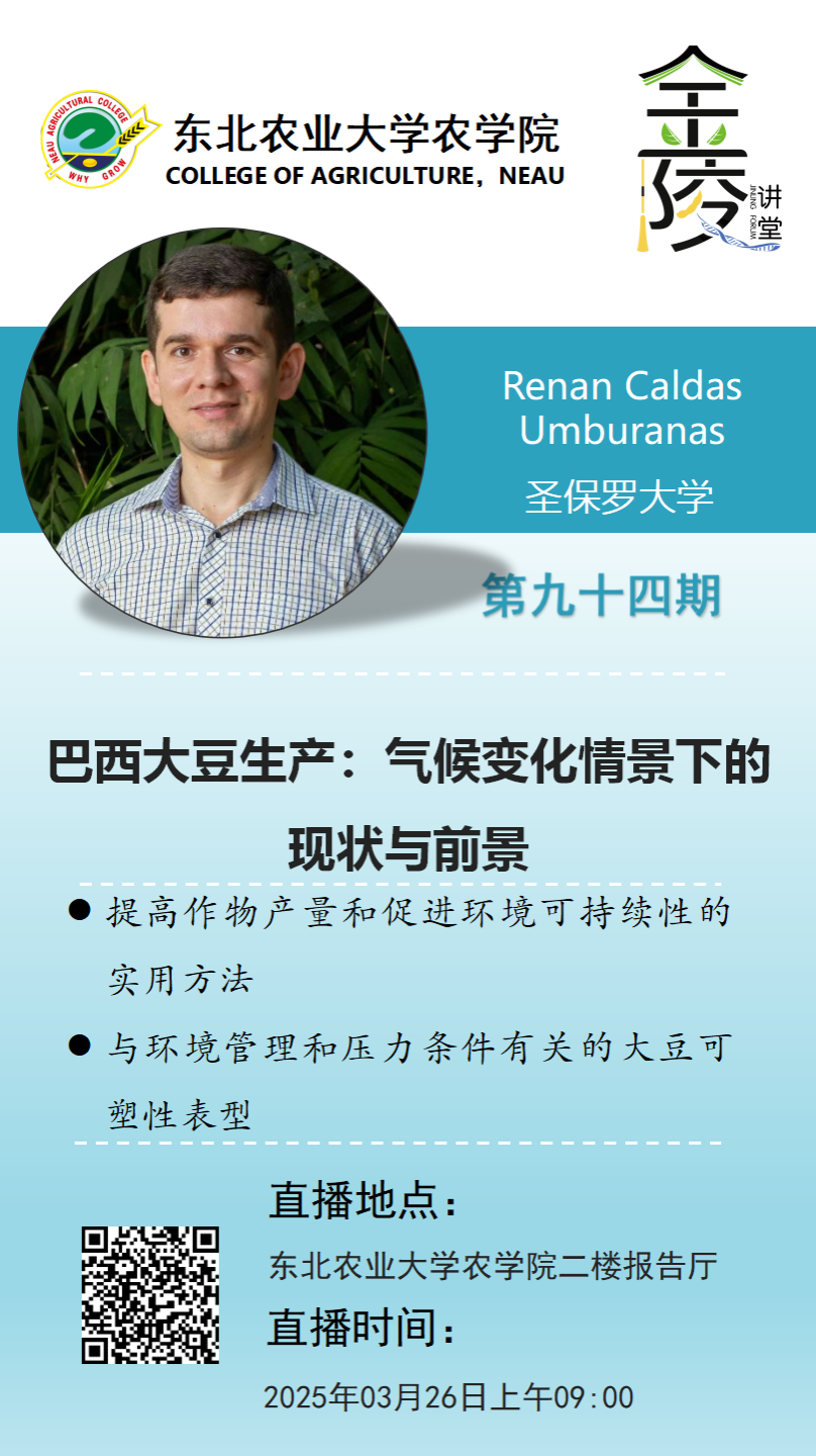Renan Caldas Umburanas,农学家,获圣保罗大学(USP)路易斯-德凯罗斯农学院(Esalq)农学(植物科学)专业硕士及博士学位。现任圣保罗大学作物科学系/路易斯-德凯罗斯农学院(Esalq)助理教授。主要研究领域为作物产量提升与环境可持续性发展的协同路径,重点关注环境管理与逆境胁迫条件下大豆表型可塑性的调控机制。