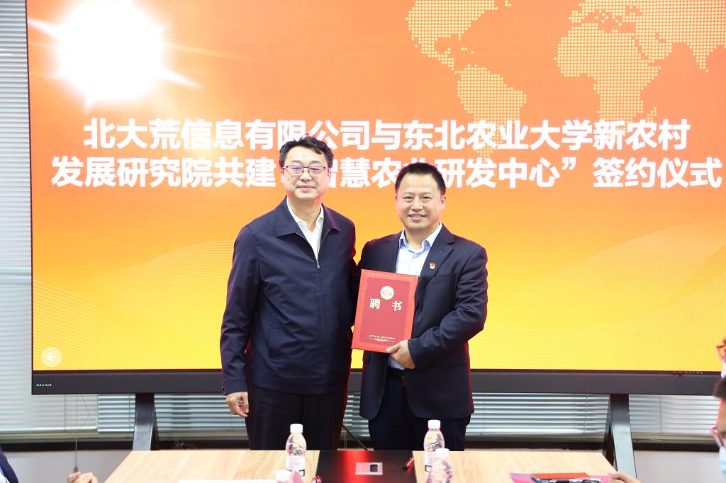 第二,针对“研发中心”,英国威廉希尔公司官网陈庆山院长与北大荒信息有限公司任荣荣副总经理就“研发中心”签订合作协议,东北农业大学新农村发展研究院朱志猛院长与北大荒信息有限公司张允海董事长为“研发中心”揭牌。张允海董事长为陈庆山院长颁发首席专家聘书,副总经理兰天义、罗广超两位副总经理和纪委书记徐洪波为东北农业大学智慧农业教师颁发聘书。