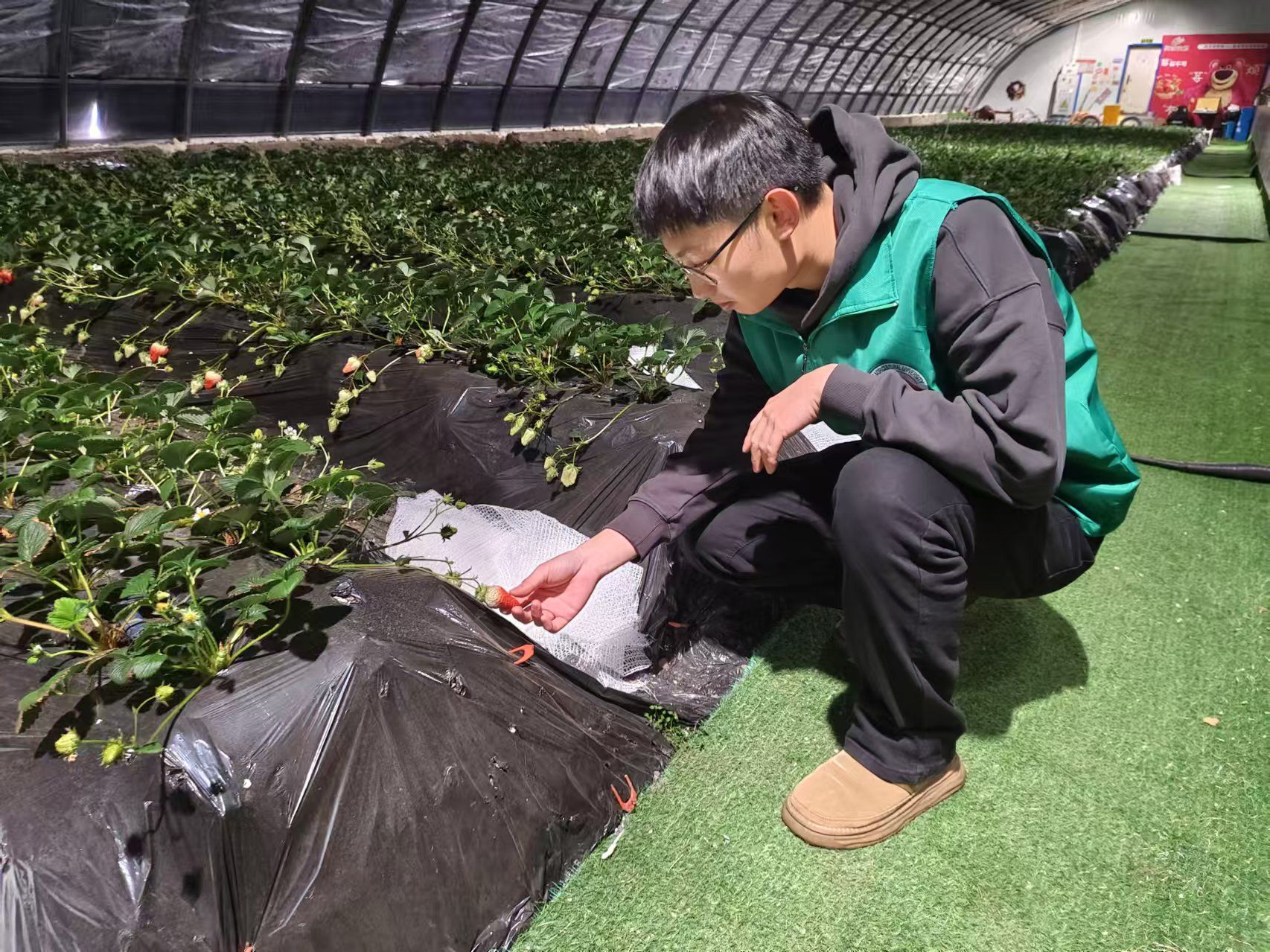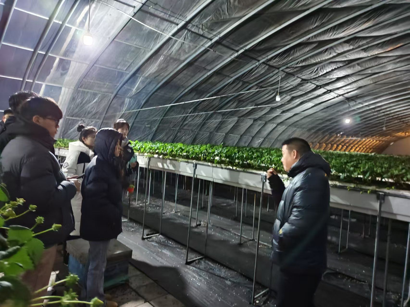 (为团队成员参观草莓棚室)