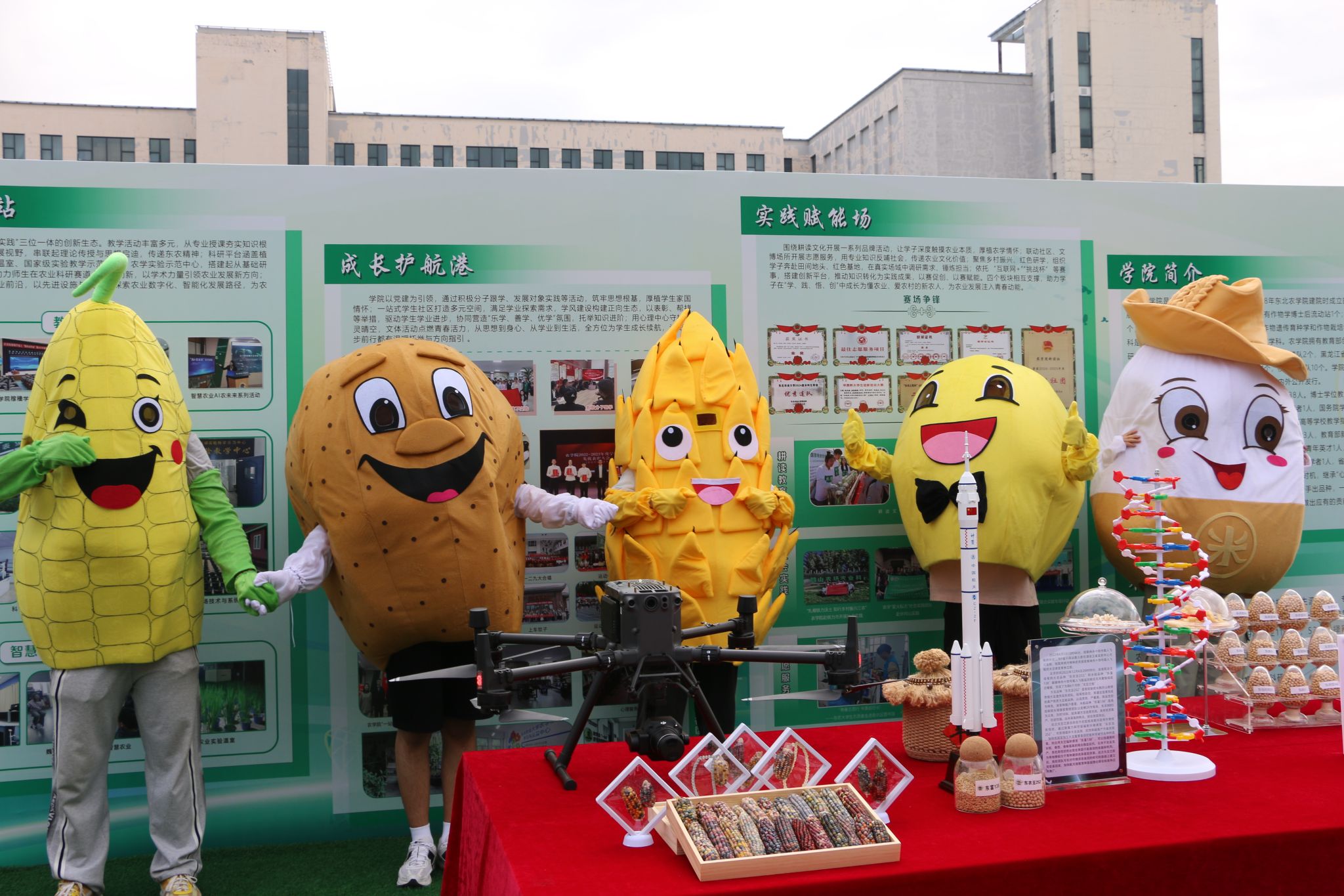 新生报到处采用特色产品展示区与桁架组合的方式,周边以农学院特色五谷花束点缀,选取色泽饱满的稻、黍、稷、麦、菽等作物,既具艺术观赏性,又能让新生沉浸式感受农耕气息。展示桌上,农学院特色科研成果、文创产品有序陈列,新生踏入场地,便能直观感受专业魅力与文化底蕴,体悟“厚德尚农,崇学养民”精神,稳稳迈出充满希望的农学新征程第一步。