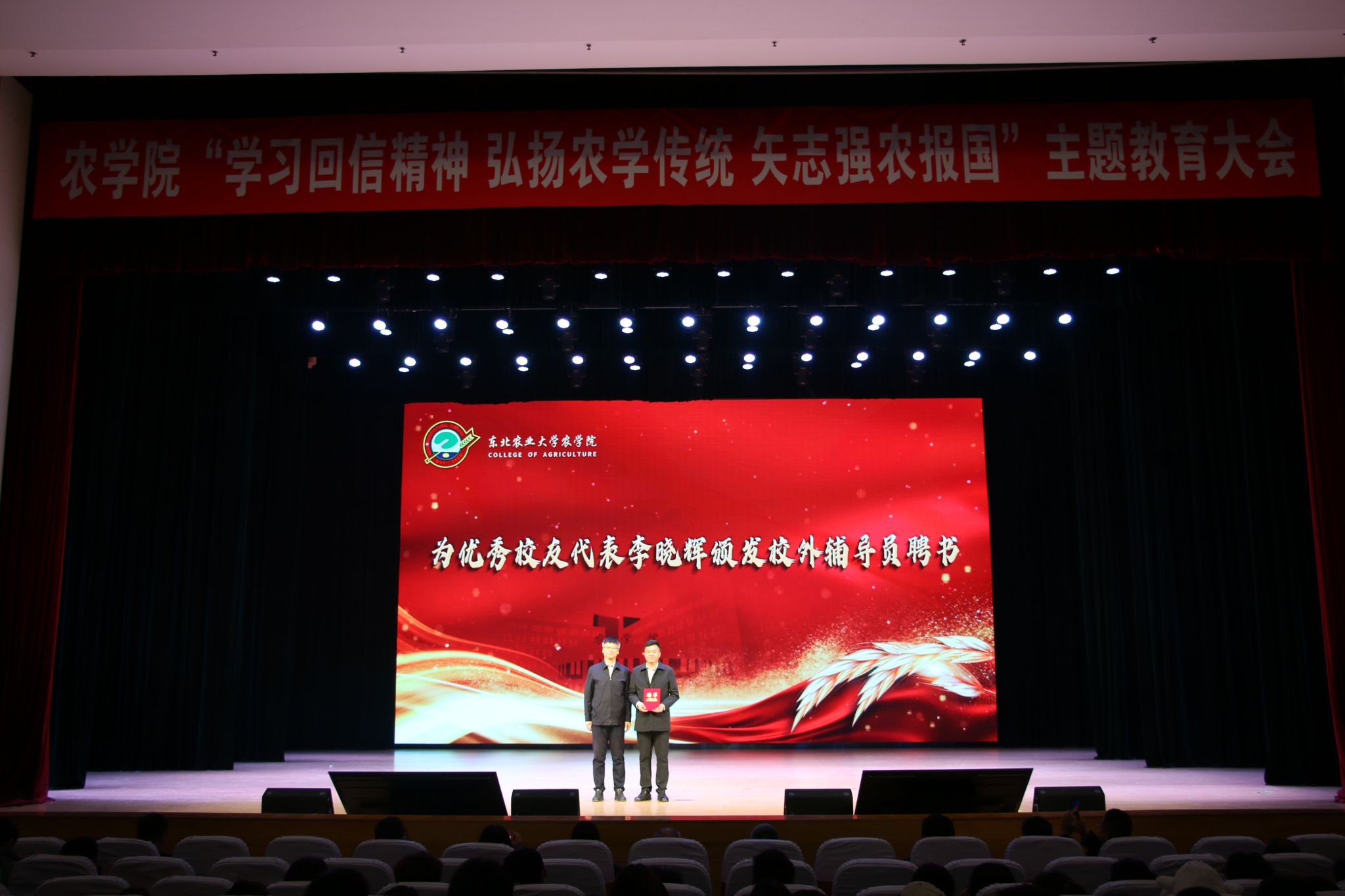 农学院党委书记李晓书为优秀校友代表李晓辉颁发校外辅导员聘书,以榜样育人,拓宽思政格局。