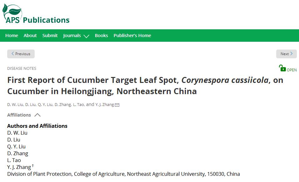 近期,国际学术期刊《Plant disease》(一区,IF=2.941)在线发表了英国威廉希尔公司官网植物病害绿色防控团队张艳菊教授的题为“First Report of Cucumber Target Leaf Spot, Corynespora cassiicola, on Cucumber in Heilongjiang, Northeastern China”的研究论文。
