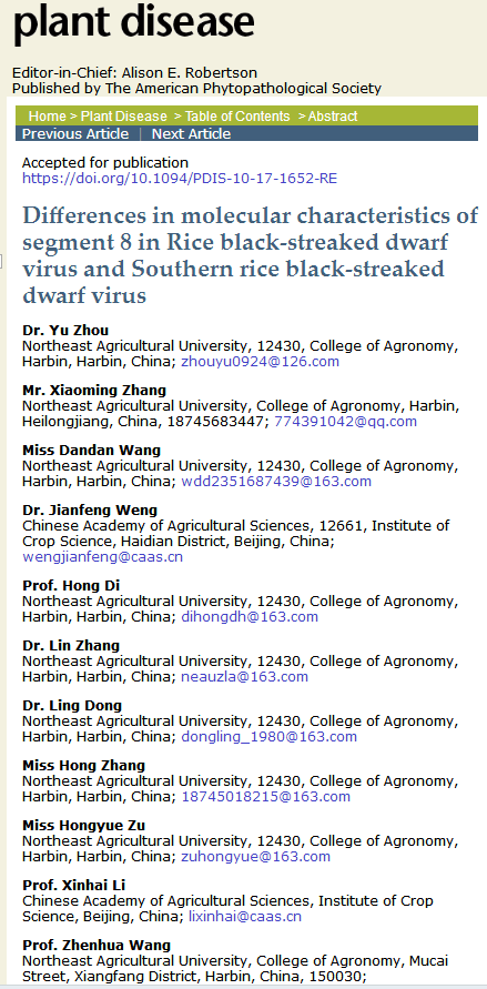 近期,国际学术期刊《Plant Disease》,(1区,IF=3.17)在线发表了东北农业大学玉米遗传育种团队的题为“Differences in molecular characteristics of segment 8 in Rice black-streaked dwarf virus and Southern rice black-streaked dwarf virus”的研究论文。
