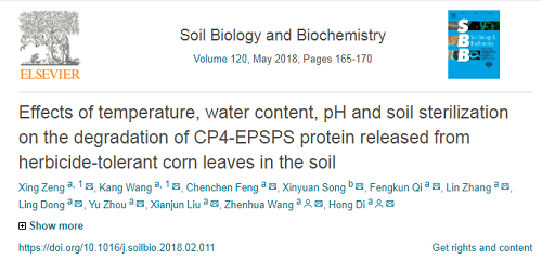 近期,国际学术期刊《Soil Biology and Biochemistry》,中科院1区,IF4.857,在线发表了英国威廉希尔公司官网玉米遗传育种团队王振华教授的题为“Effects of temperature, water content, pH and soil sterilization on the degradation of CP4-EPSPS protein released from herbicide-tolerant corn leaves in the soil”的研究论文。