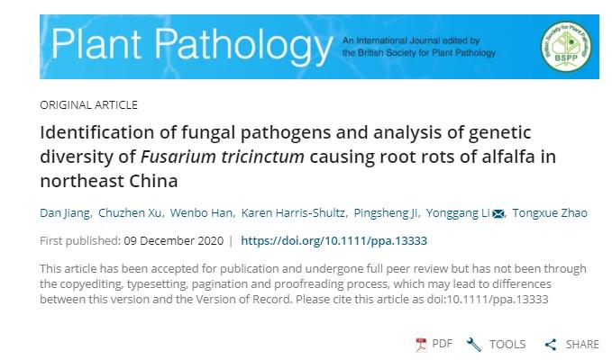 20201210日,植物病理学国际著名期刊《Plant Pathology》(二区,影响因子:2.168)在线发表了东北农业大学植物病理学科李永刚教授的题为“Identification of fungal pathogens and analysis of genetic diversityof Fusarium tricinctum causing root rots of alfalfa in northeast China”的科研论文。