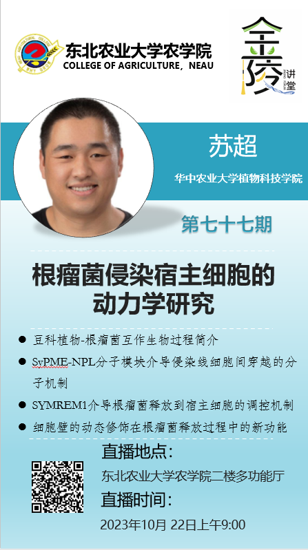 在根瘤菌与豆科植物建立共生关系的过程中,根毛会经过一系列形变捕获到根瘤菌形成侵染室,随后在根毛中诱导一个由细胞壁与细胞膜包裹的管状通道,被称为侵染线。侵染线形成后需要穿越皮层细胞运输根瘤菌到达根瘤原基,进而释放根瘤菌到宿主细胞形成共生体进行固氮。这一系列复杂的生物学变化的背后是由一系列分子模块所调控的。本次报告主要包括以下4部分内容: