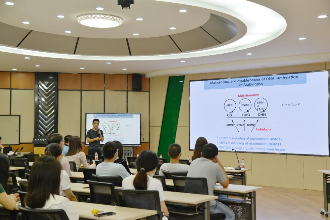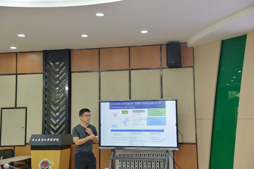 王海峰教授就做了题为《植物DNA甲基化与基因组进化》的报告。他谈到,植物基因多倍体事件普遍发生,而DNA甲基化能够调控多拷贝基因功能分化控制其发生。希望通过研究植物进化表观基因组学,了解植物DNA甲基化机制,为增强植物环境耐受力与预防疾病打下基础。