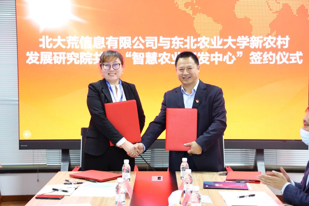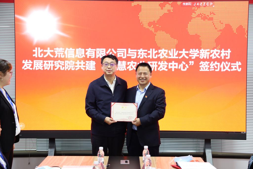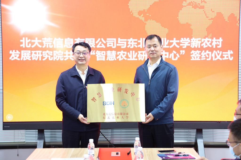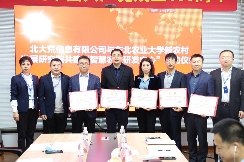 第二,针对“研发中心”,英国威廉希尔公司官网陈庆山院长与北大荒信息有限公司任荣荣副总经理就“研发中心”签订合作协议,东北农业大学新农村发展研究院朱志猛院长与北大荒信息有限公司张允海董事长为“研发中心”揭牌。张允海董事长为陈庆山院长颁发首席专家聘书,副总经理兰天义、罗广超两位副总经理和纪委书记徐洪波为东北农业大学智慧农业教师颁发聘书。