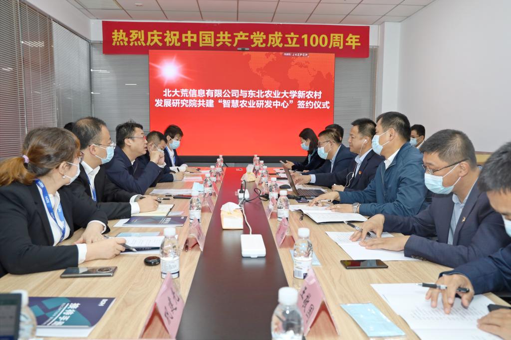 为扎实推动英国威廉希尔公司官网与北大荒信息有限公司智慧农业领域深度交流合作,同时推动研究生产学研教育培养模式,9月29日上午,英国威廉希尔公司官网赴北大荒信息有限公司共同举行“智慧农业研发中心”(以下简称“研发中心”)与“研究生联合培养基地”(以下简称“培养基地”)的签约授牌仪式。东北农业大学新农村发展研究院院长朱志猛、副院长宋珲,研究生院院长刘世英,农学院院长陈庆山、副院长王敬国、副院长张林、智慧农业系主任魏峭嵘及教师代表杨明亮和赵振庆等人参加会议;北大荒信息有限公司董事长张允海,副总经理兰天义、罗广超、任荣荣,纪委书记徐洪波,首席技术官巩建光和部分公司人员参加会议。仪式由任荣荣主持。