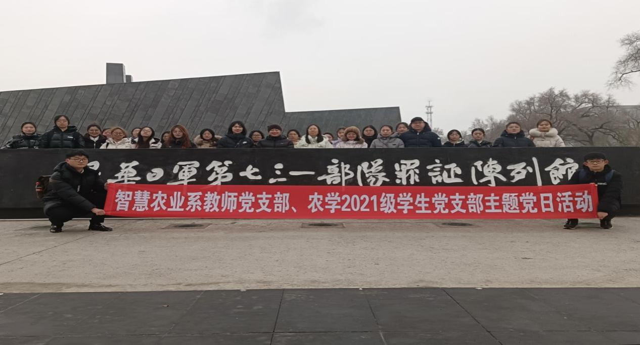 在第十个国家公祭日到来之际,农学院智慧农业系教师党支部与农学2021级学生党支部于12月8日前往七三一部队罪证陈列馆,联合开展主题党日活动。缅怀革命先烈,重温革命历史,坚定理想信念,培养师生党员爱国主义情感,进一步明确师生党员的时代责任和担当,在今后的学习工作中以史为鉴,努力奋斗,为推进强国建设、民族复兴作出应有贡献。