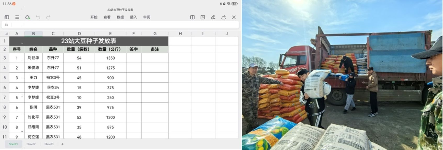 帮助连队制作大豆种子分发表格,帮助农场管理人员发放种子进行人员及种子登记,实际体验农场一线工作人员的工作。