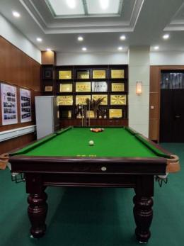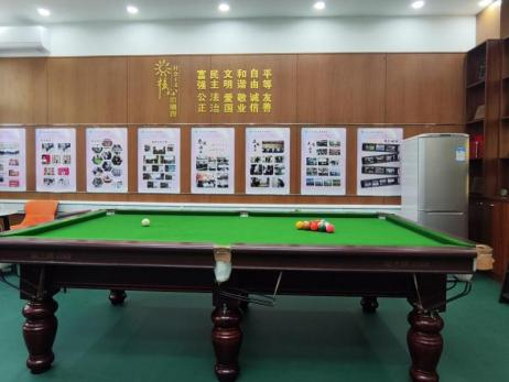 健身区域汇聚多款专业器材,HEAD水阻划船机凭借水阻模拟技术还原真实划船体验,为核心力量与上肢肌群锻炼提供优质选择;红色动感单车动感十足,成为教职工释放压力的有氧训练优选;多功能综合训练器整合坐姿推胸、高位下拉等十余种训练模式,适配不同年龄段与健身目标;两台窗边跑步机可精准调节速度与坡度,满足晨间热身、下班后冲刺等多样化跑步需求。此外,哑铃、壶铃等小型器材与踏步机搭配,方便利用碎片时间开展力量训练或轻量运动;全新升级的标准台球桌,更成为教职工社交休闲的“新地标”,实现运动与交流的双向赋能。